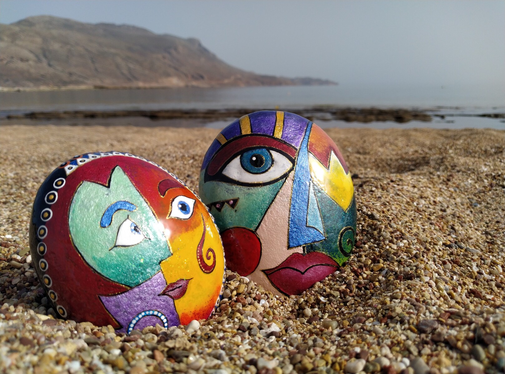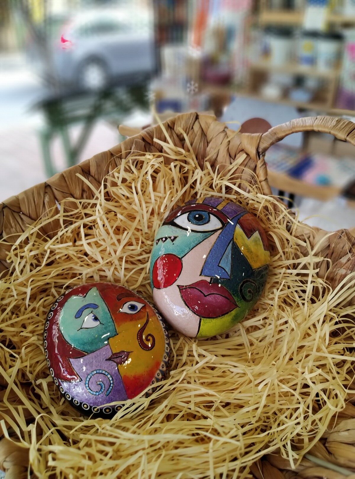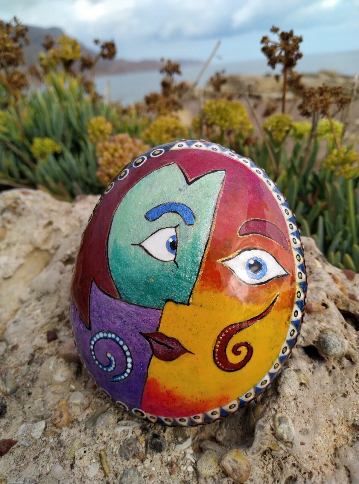 This hand painted stone features a striking abstract face,blending bold lines and expresive shapes to evoke emotion and curiosity.Each brushstroke adds a unique texture,turning the natural surface of the stone into a one-of-a-kind piece of art ,that invites the viewer to interpret it’s meaning.