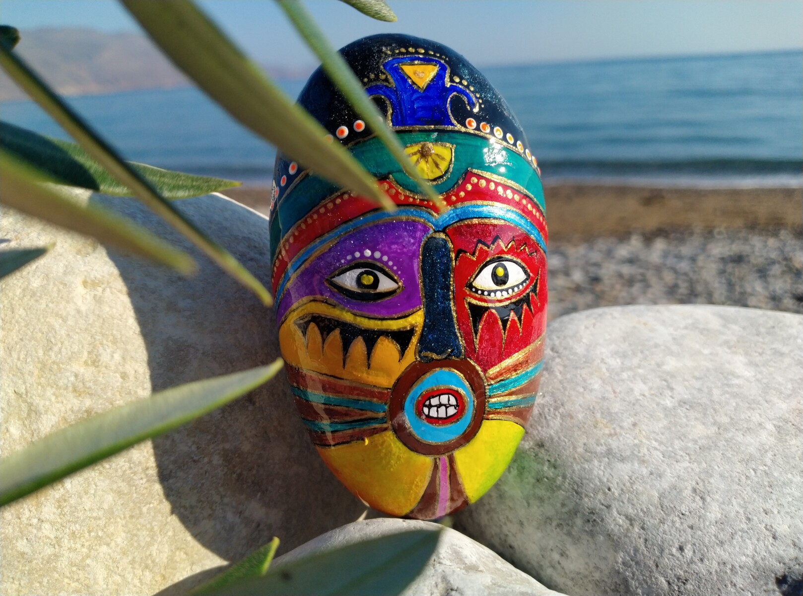 A striking African Mask,rich with tribal patterns and earthy tones,is intricately painted on a smooth sea stone,blending cultural heritage with the natural beauty of the sea.