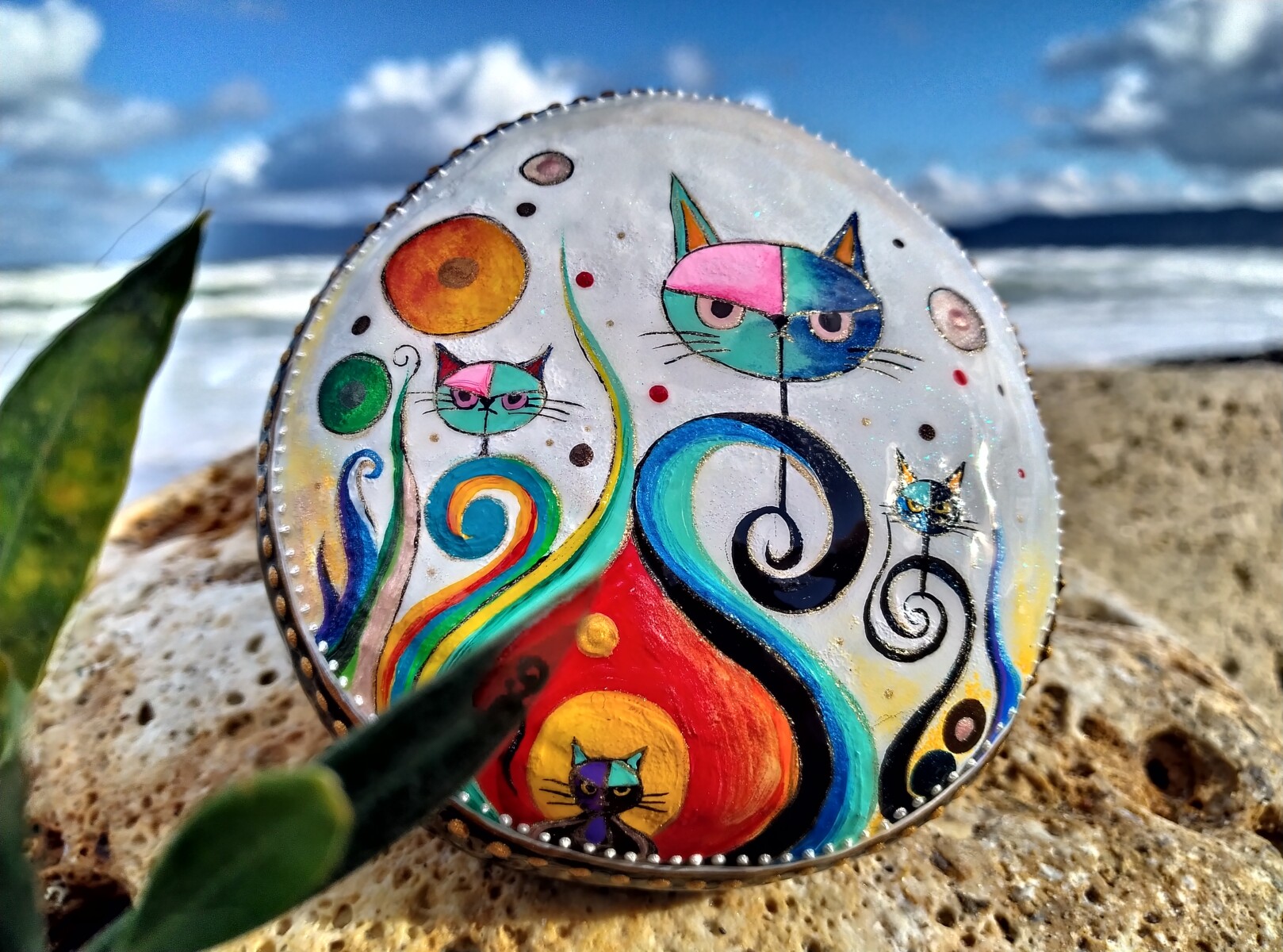 This hand-painted sea stone features a vibrant and whimsical Kitties,bursting with color and personality.Carfeully crafted with joyful brushstrokes,the feline character radiates happinesand charm,making it a delightful piece of art.The natural curves and texture of the sea stone enhance the uniqueness of the painting turning it into one-of-a-kind treasure.Perfect as a decorative item,a heartfelt gift,or a little token of joy.