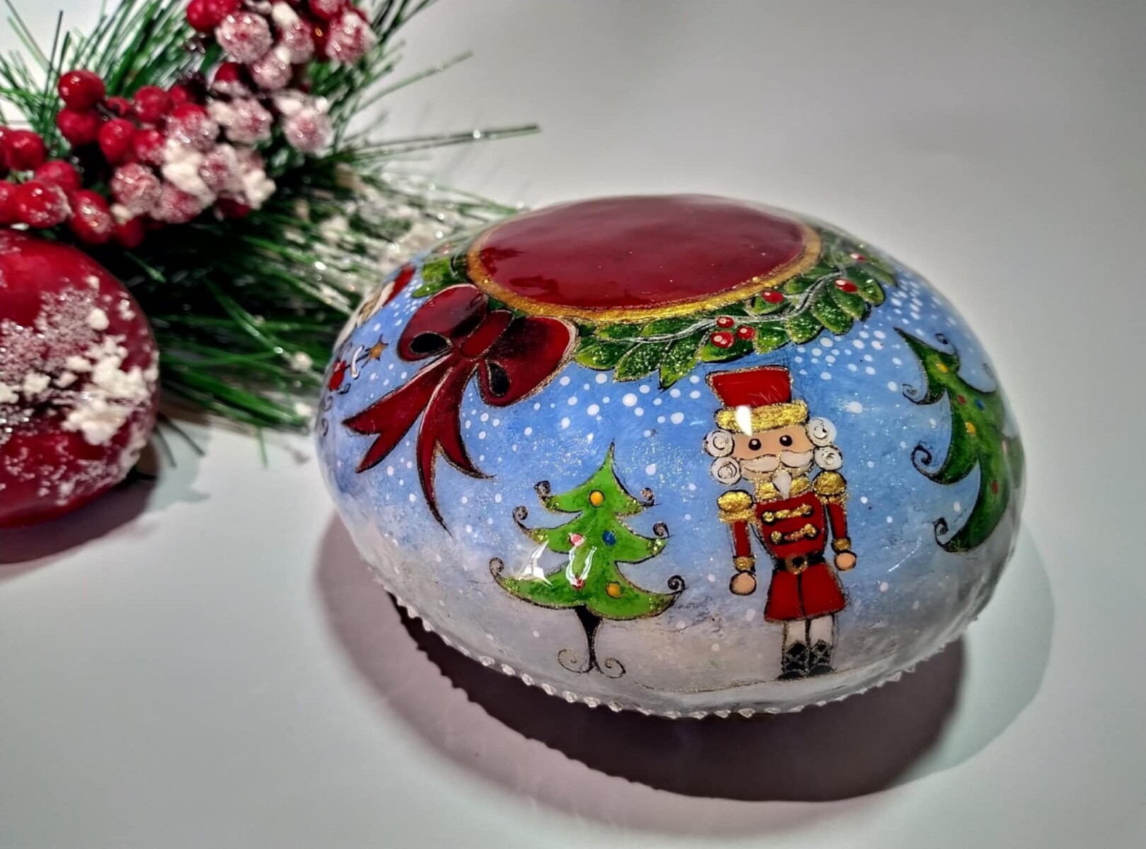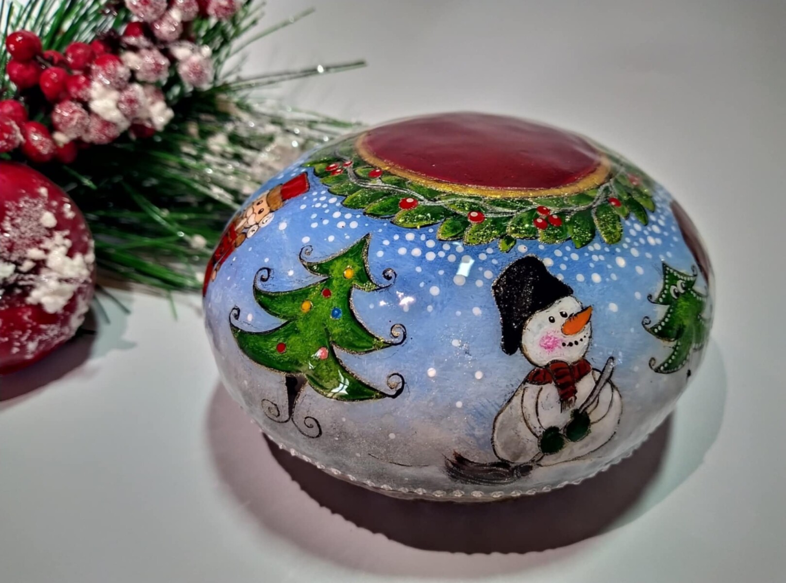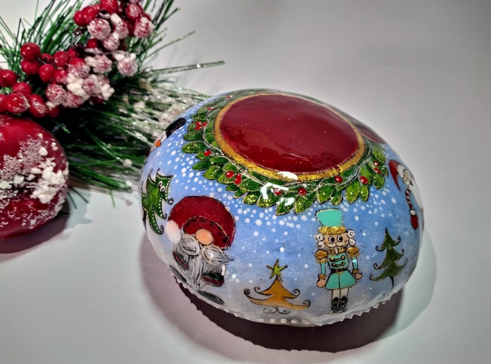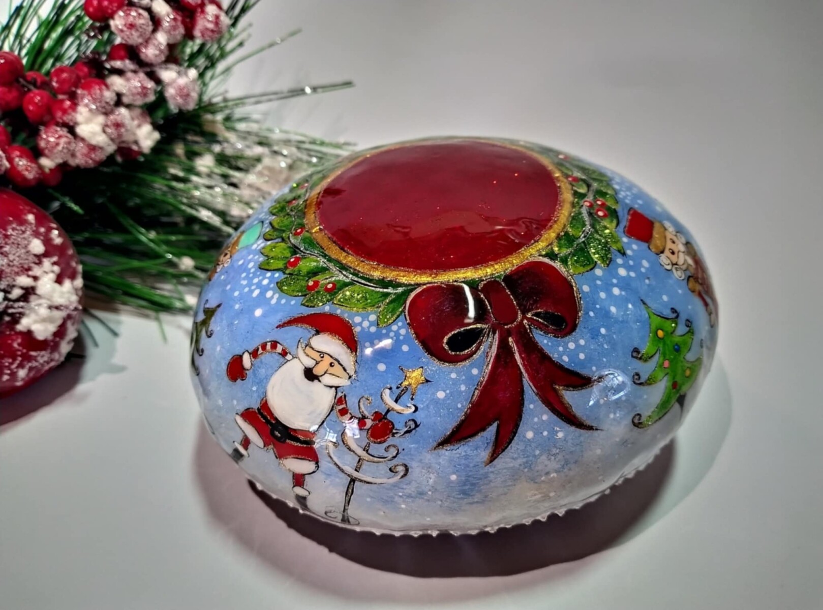 Celebrate the holiday season with this beautifully hand-painted Christmas sea stone,featuring intricate designs of a sparkling jewel,a festive Christmas tree,Santa Claus,a charming nutcrucker,a cheerful gnome and a snowman,all adorned with a graceful ribbon,capturing the magic and joy of Christmas in a unique costal artwork.