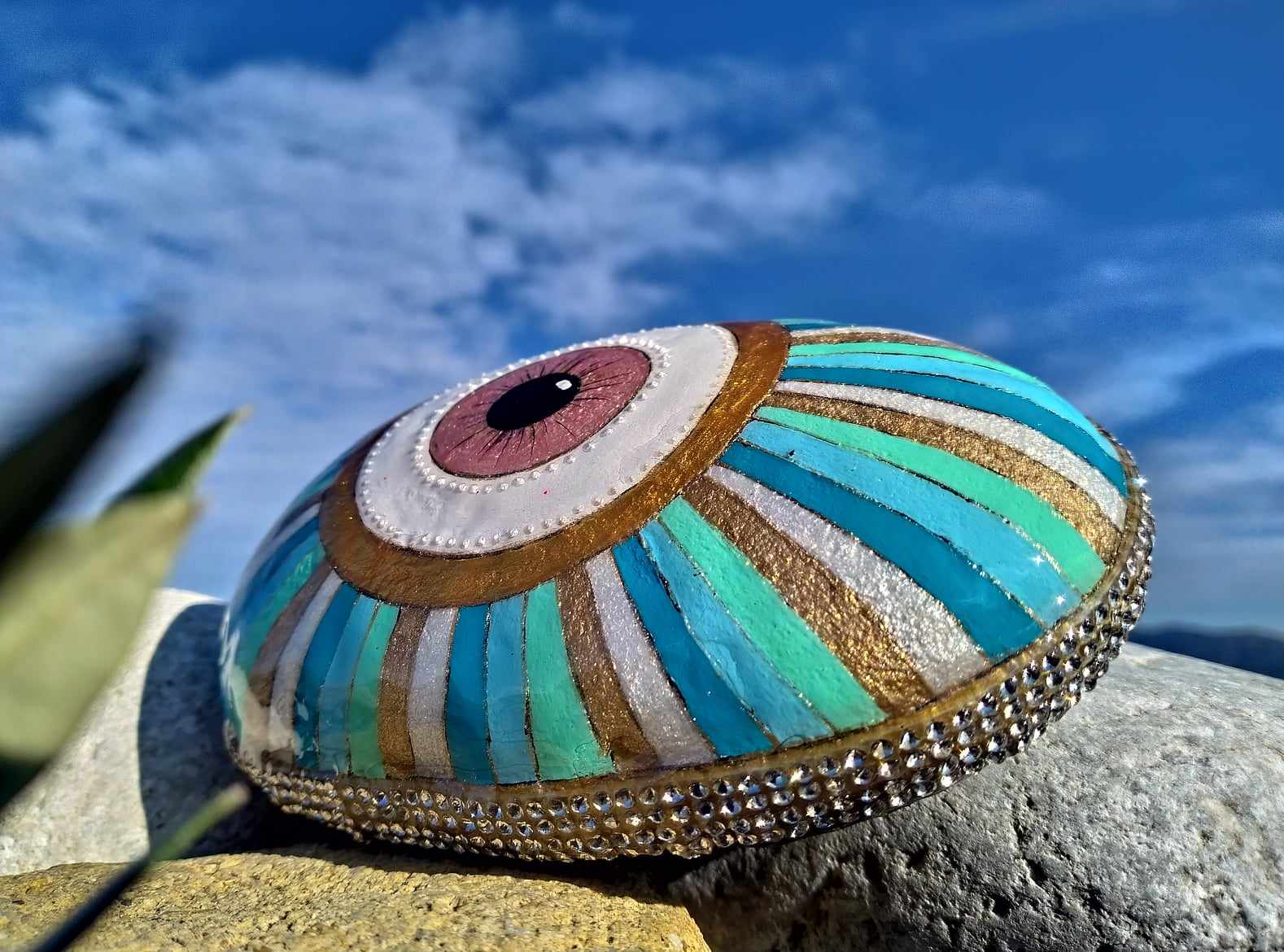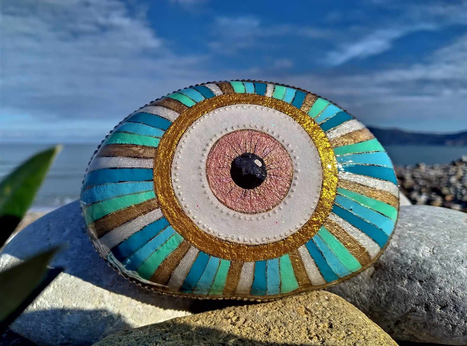 This hand-painted sea stone features the iconic evil eye,a symbol of protection and good energy,deeply rooted in Greek tradition.Inspired by my love for its meaning and aestheticks,I used high quality acrylic paints and sealed with resin to create lasting piece of art.