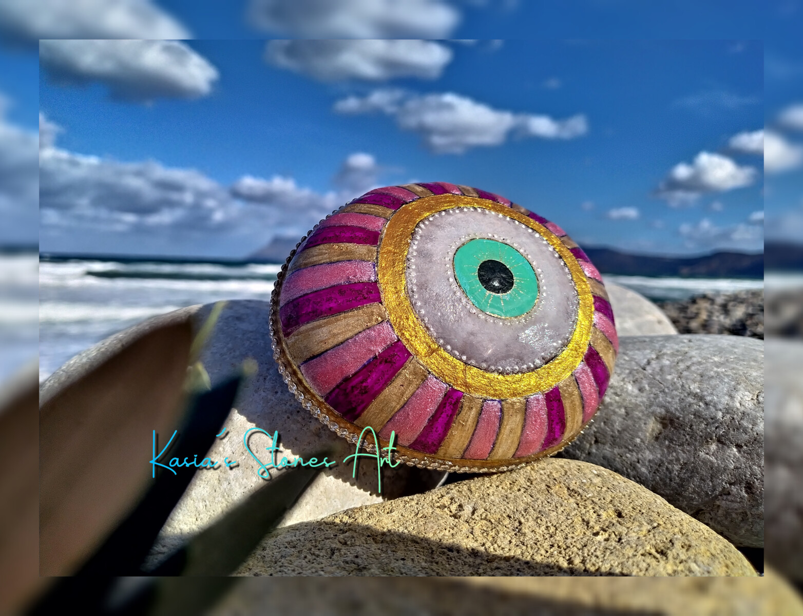 This hand-painted sea stone features the iconic Evil Eye, inspired by Greek tradition and my love for protective symbols.Using high quality acrylic paints and seald with resin,it combines cultural heritage with artistic expression.