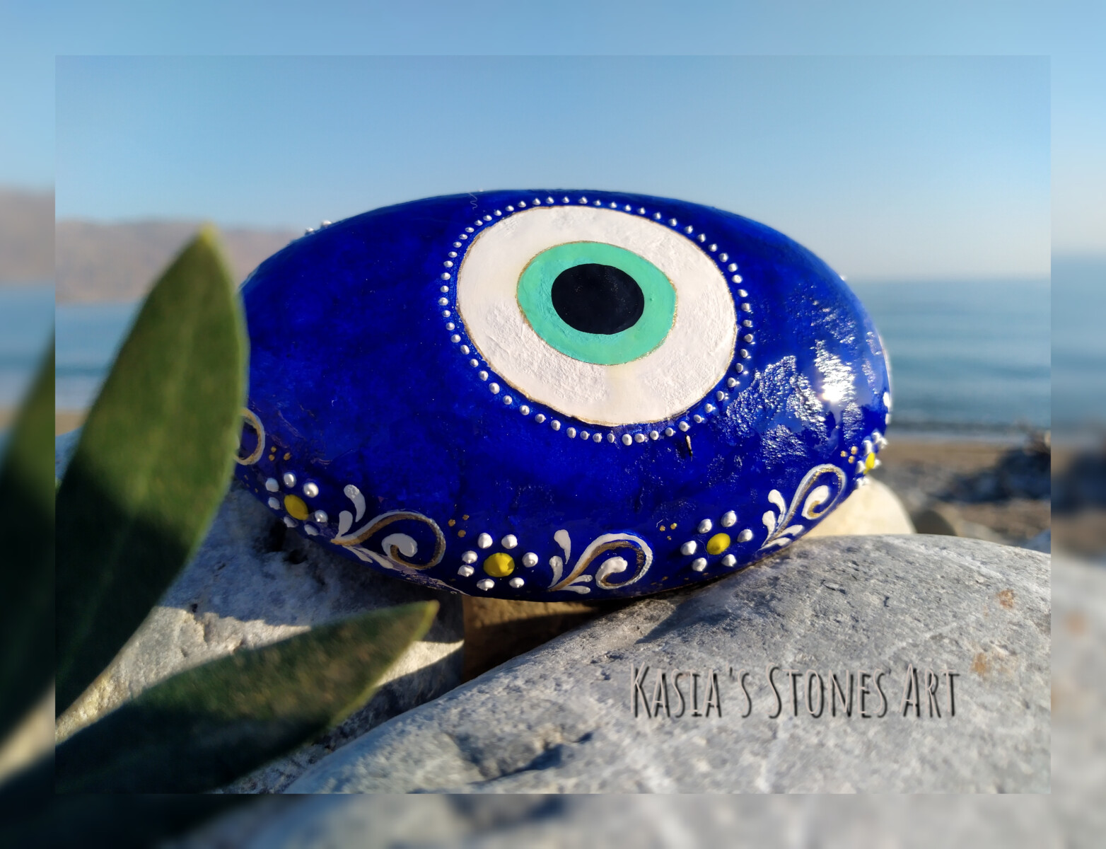 This hand-painted sea stone features the iconic Evil Eye, inspired by Greek tradition and my love for protective symbols.Using high quality acrylic paints and seald with resin,it combines cultural heritage with artistic expression.