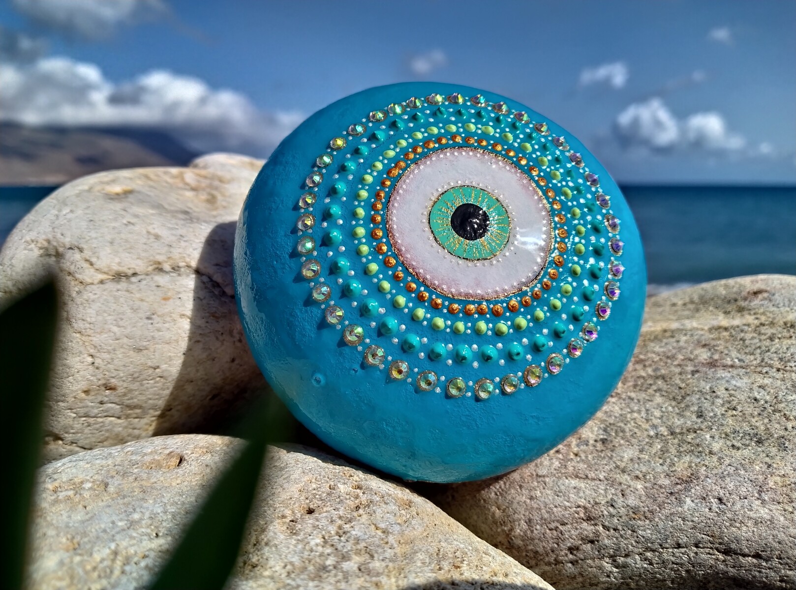 This hand-painted sea stone features the iconic Evil Eye, inspired by Greek tradition and my love for protective symbols.Using high quality acrylic paints and seald with resin,it combines cultural heritage with artistic expression.