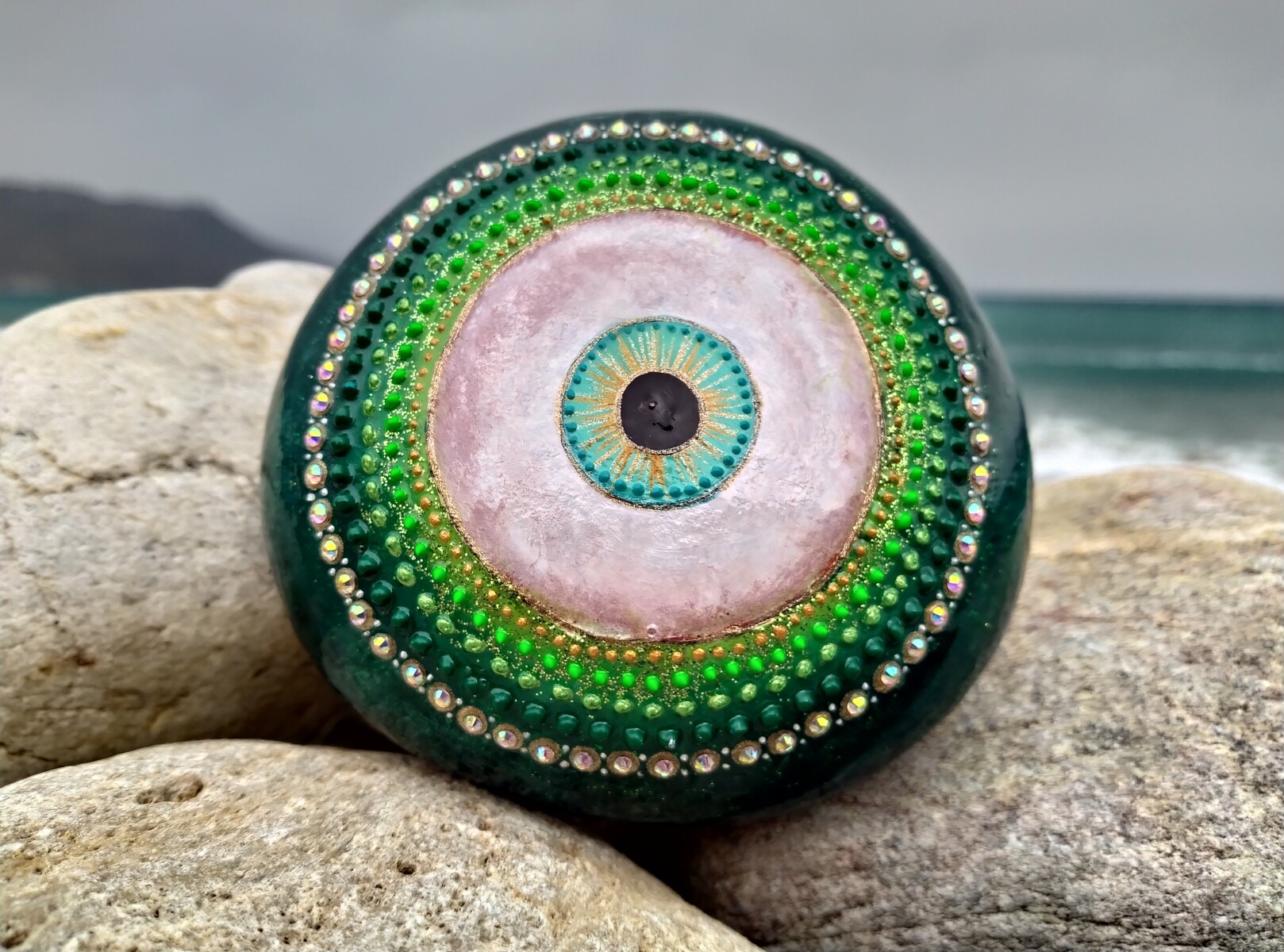 This hand-painted sea stone features the iconic evil eye,a symbol of protection and good energy,deeply rooted in Greek tradition.Inspired by my love for its meaning and aestheticks,I used high quality acrylic paints and sealed with resin to create lasting piece of art.