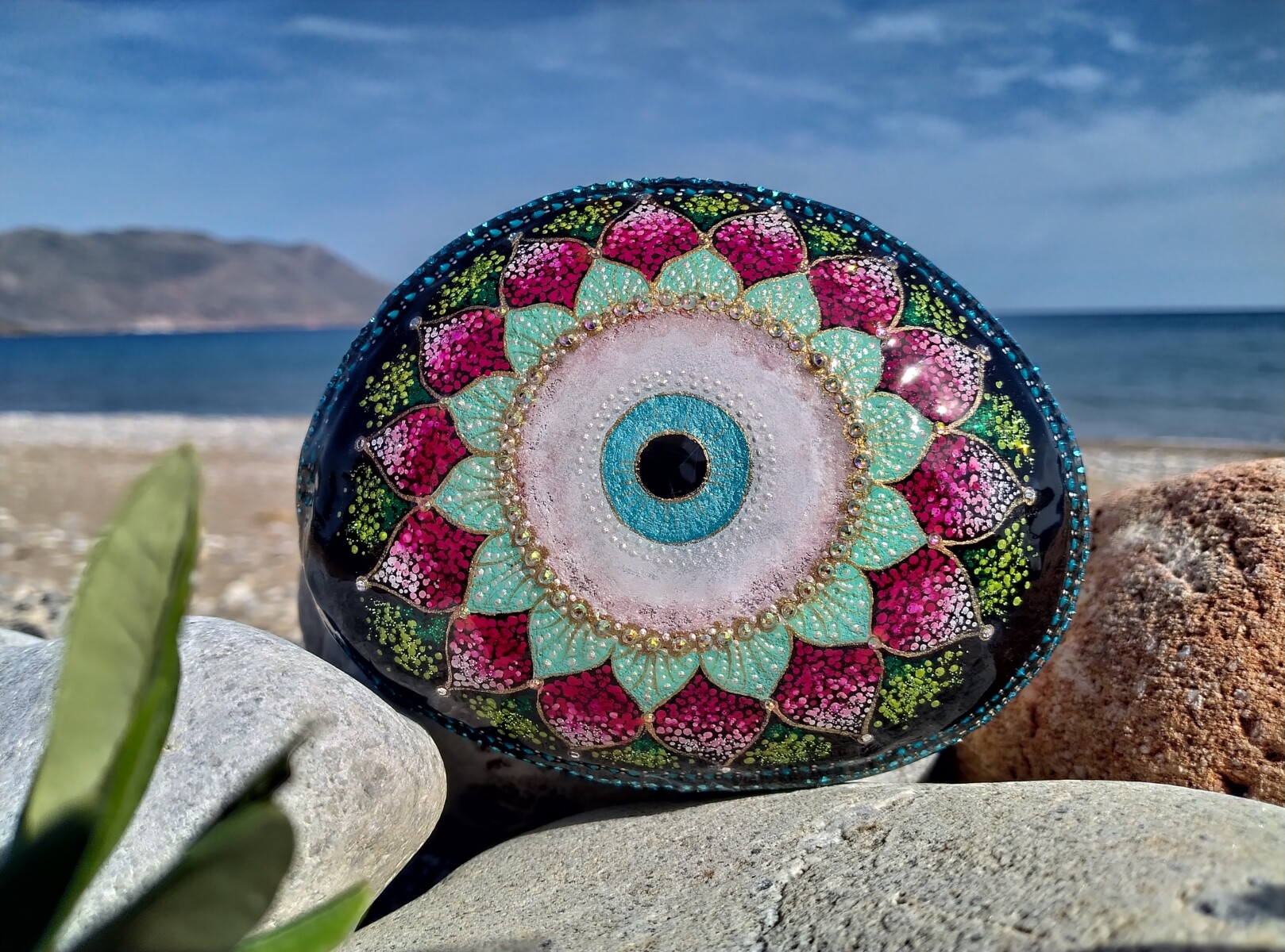 This hand-painted sea stone features the iconic Evil Eye, inspired by Greek tradition and my love for protective symbols.Using high quality acrylic paints and seald with resin,it combines cultural heritage with artistic expression.