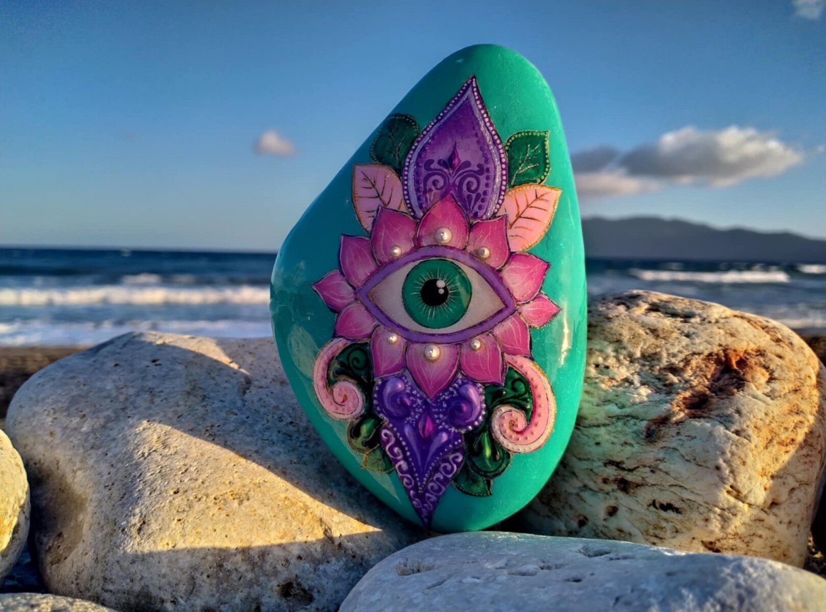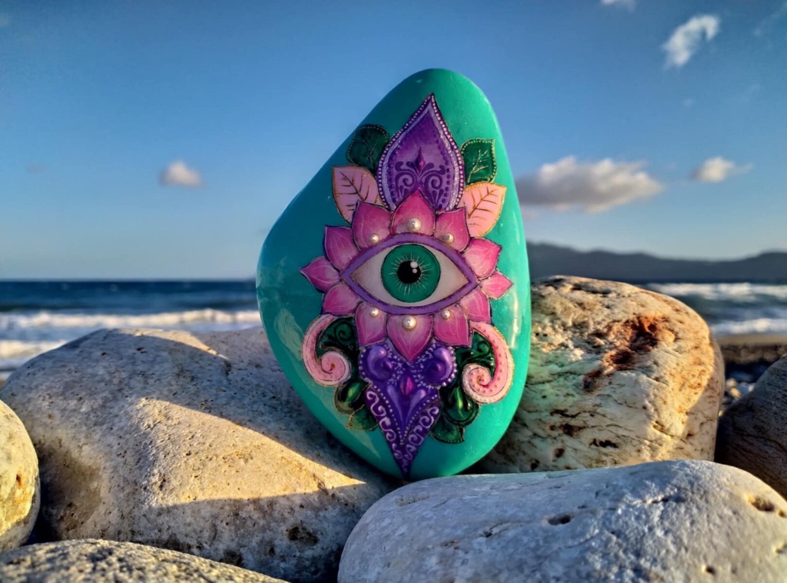 This hand-painted sea stone features the iconic evil eye,a symbol of protection and good energy,deeply rooted in Greek tradition.Inspired by my love for its meaning and aestheticks,I used high quality acrylic paints and sealed with resin to create lasting piece of art.