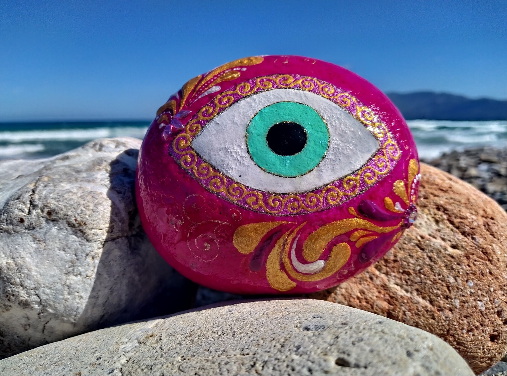 b)This hand-painted sea stone features the iconic evil eye,a symbol of protection and good energy,deeply rooted in Greek tradition.Inspired by my love for its meaning and aestheticks,I used high quality acrylic paints and sealed with resin to create lasting piece of art.