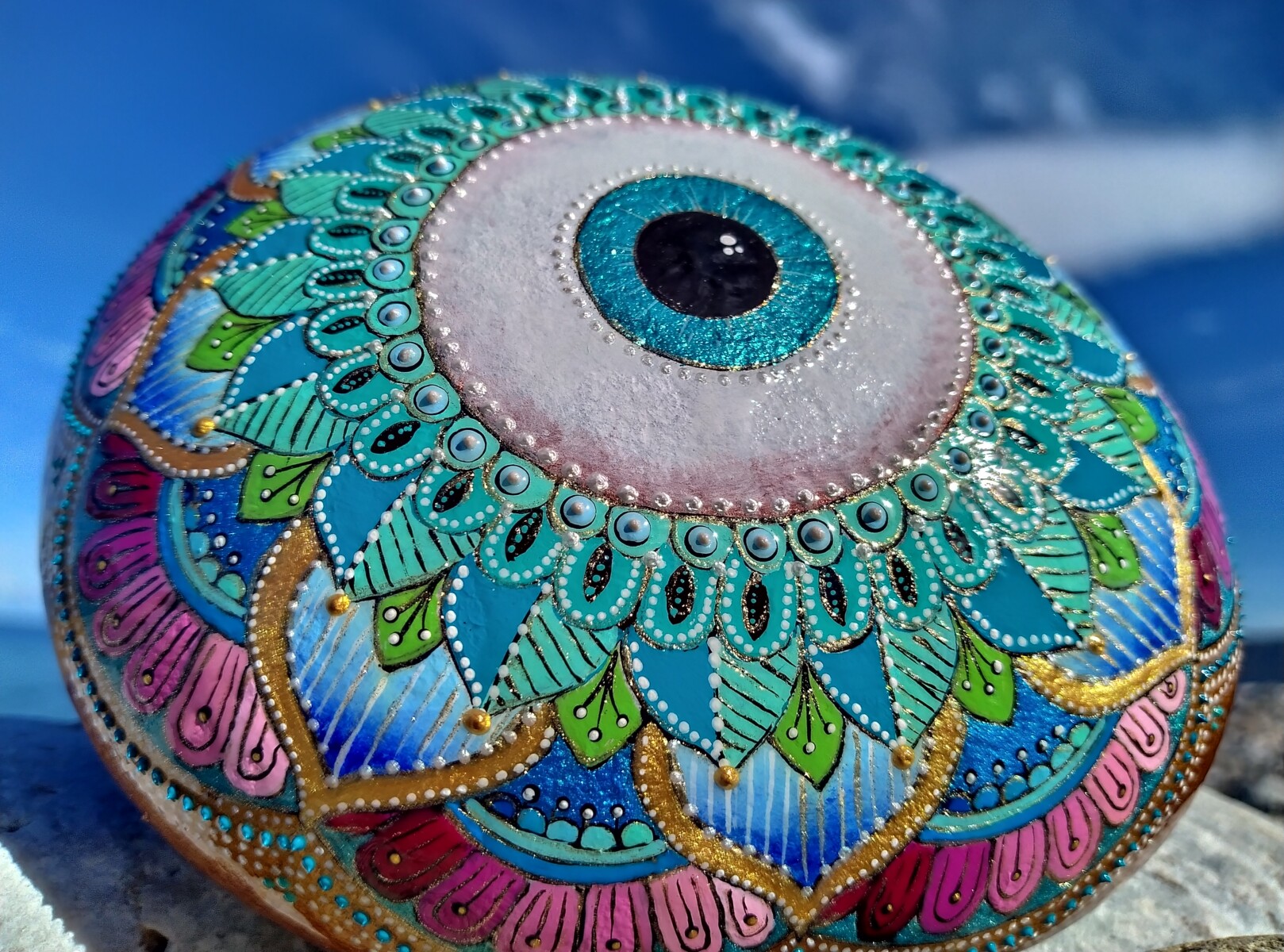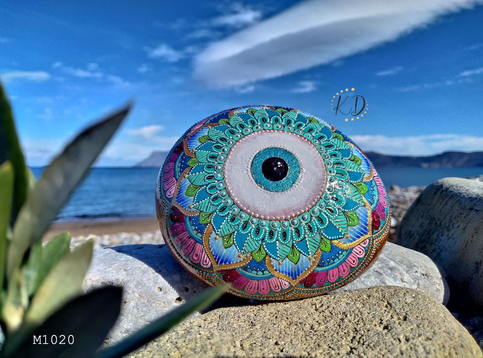This hand-painted sea stone beautifully blends the protective power of Evil Eye with the calming,harmonious patterns of Mandala.The combination symbolizes both spiritual protection and inner peace,making it a unique and meanigful piece.