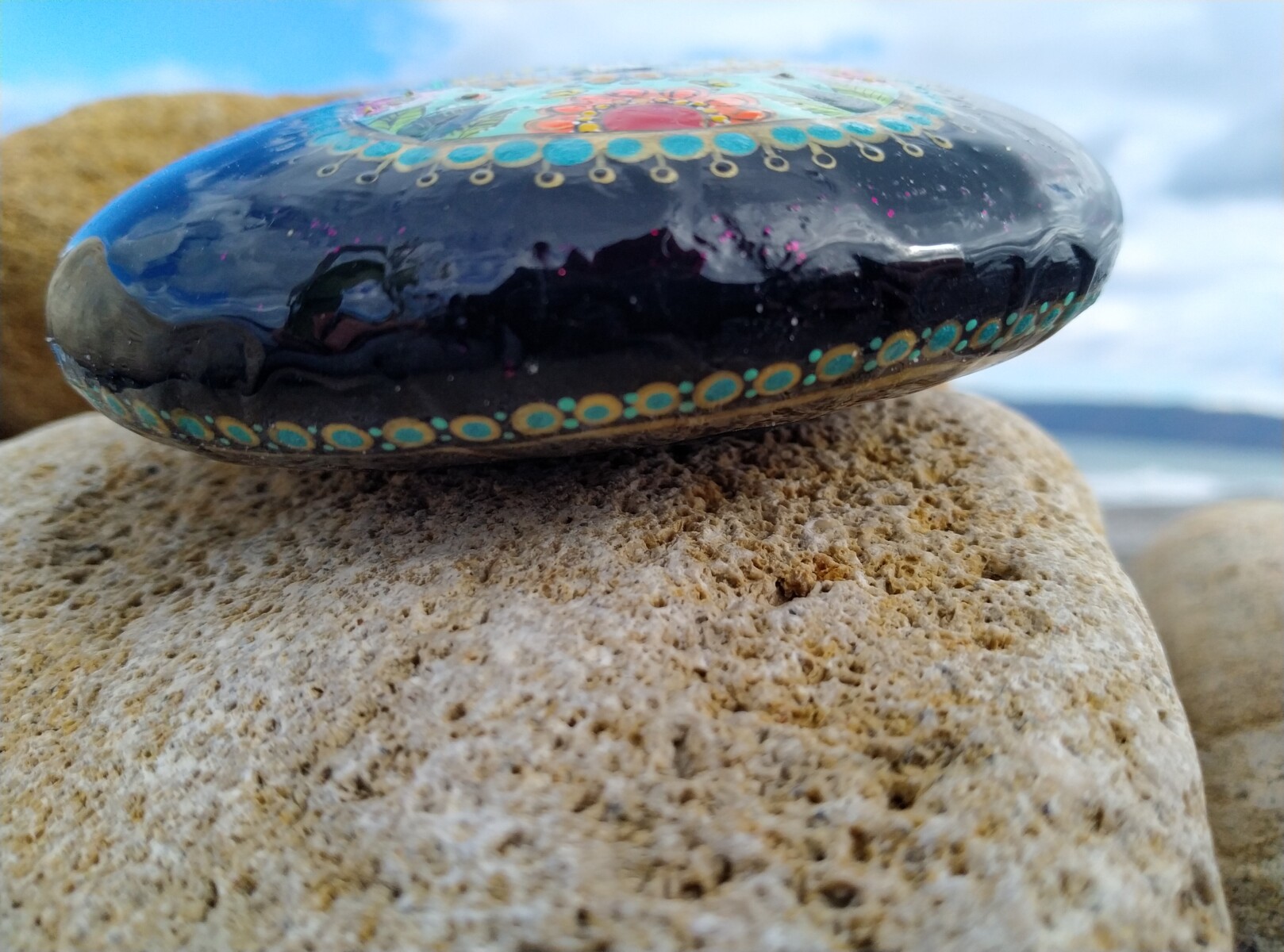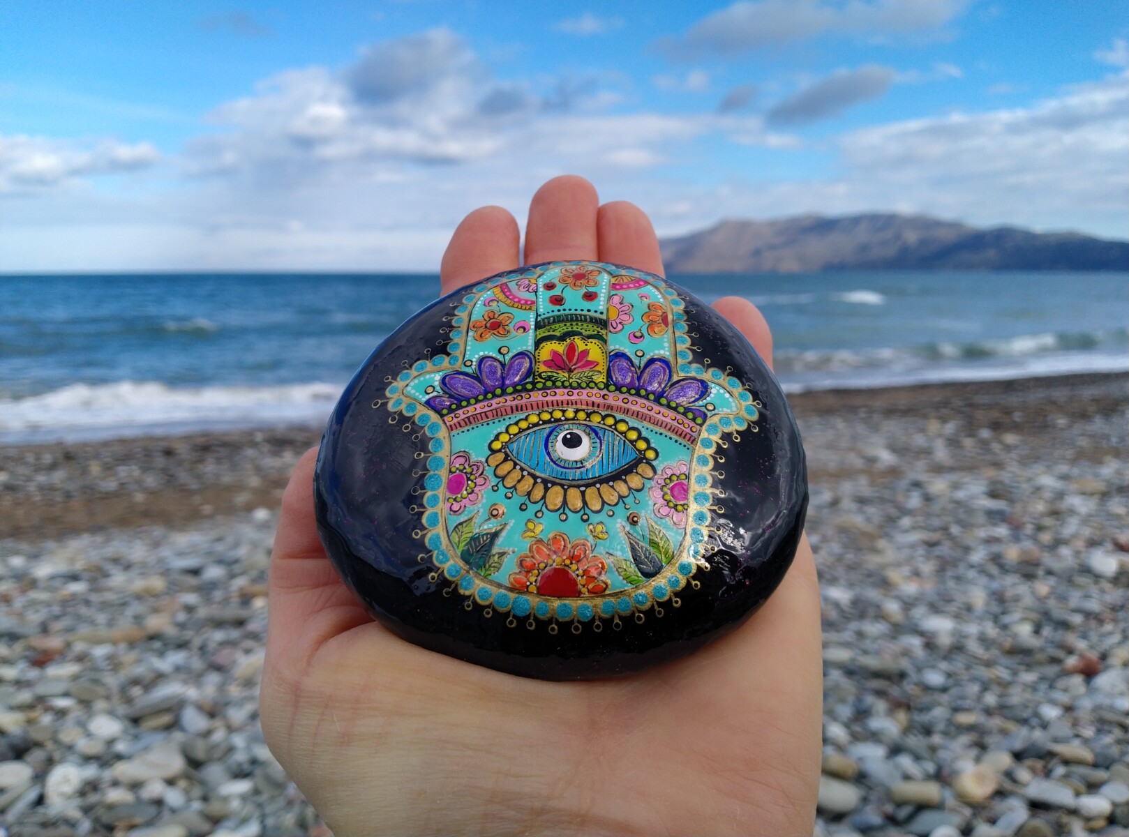 A sacred hand -painted stone adorned with the Hamsa,an ancient symbl of devine protection,radiating peace,healing energy and spiritual harmony.