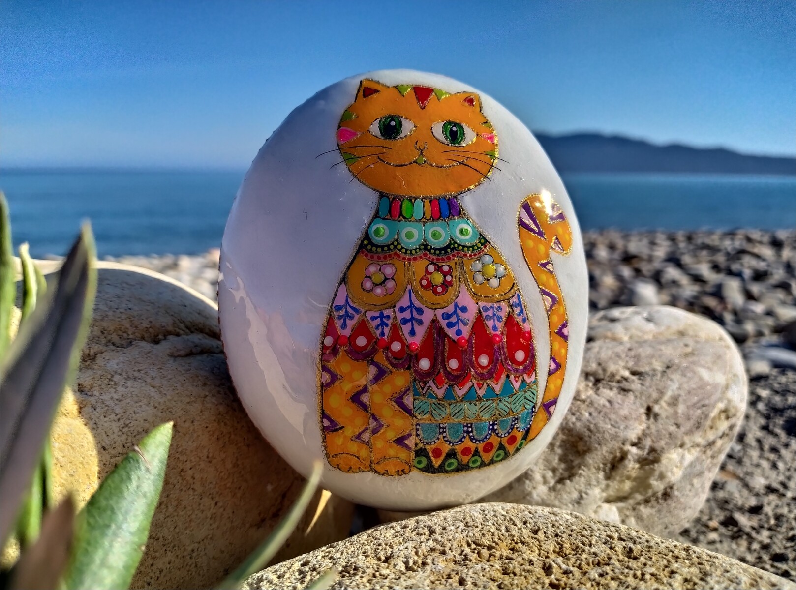 Say hallo to this cheerful little kitty,hand-painted on sea stone!Bursting with bright colors and a big personality,this joyful cat is here to spread smiles and sunshine wherever it goes.With a quirky charm and plenty of cattitude,it’s the purrfect companion for Your desk or shelf.One-of-a-kind,just like every fabulous feline.