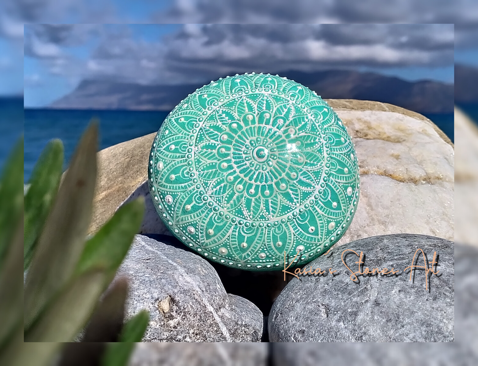 This hand-painted sea stone showcases a vibrant Mandala desin,symbolizing balance,harmony and the interconnectedness of all things.Each intricate pattern reflects a sense of peace and mindfulness,makingit a truly unique,spiritual piece.
