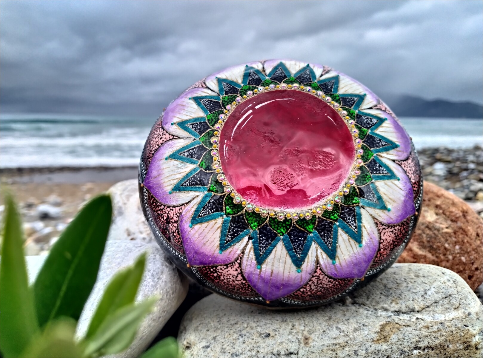 This hand-painted sea stone showcases a vibrant Mandala desin with a jewel in the center,symbolizing balance,harmony and the interconnectedness of all things.Each intricate pattern reflects a sense of peace and mindfulness,makingit a truly unique,spiritual piece.