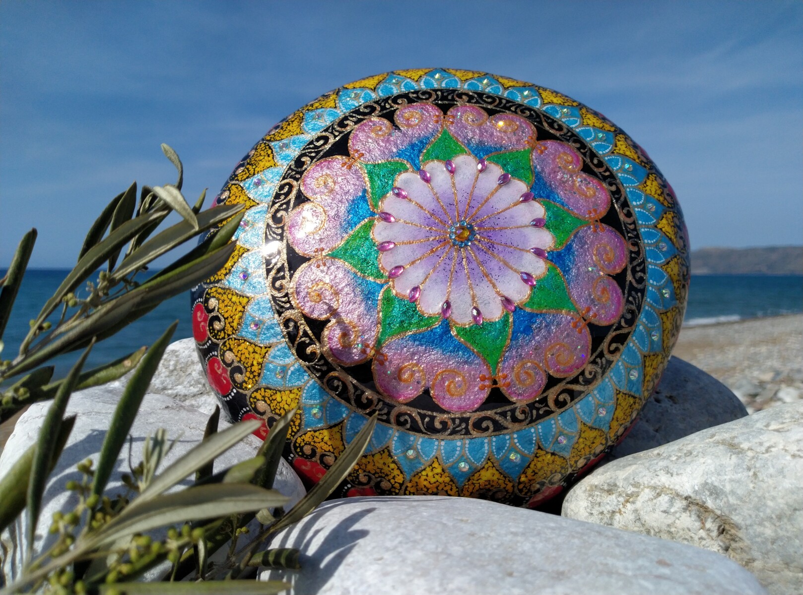 This hand-painted sea stone showcases a vibrant Mandala Flower desin,symbolizing balance,harmony and the interconnectedness of all things.Each intricate pattern reflects a sense of peace and mindfulness,makingit a truly unique,spiritual piece.