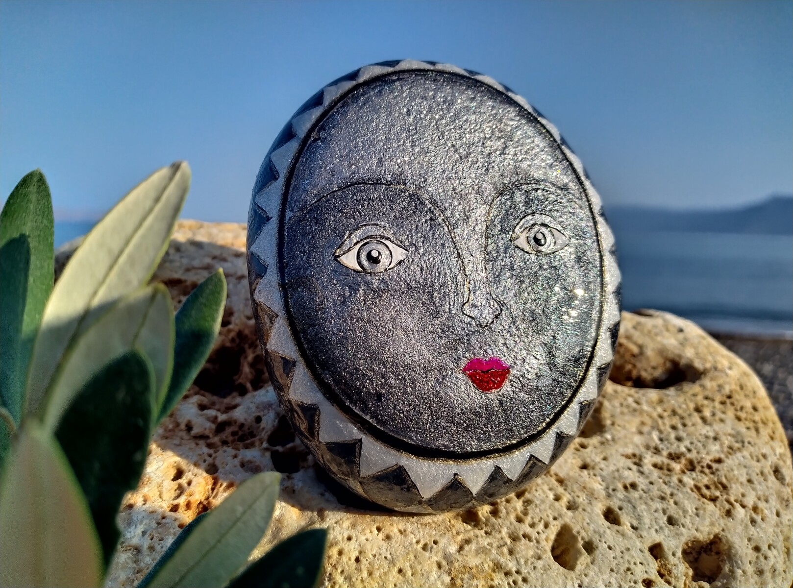 This hand painted stone features a striking Mystic Face,blending bold lines and expresive shapes to evoke emotion and curiosity.Each brushstroke adds a unique texture,turning the natural surface of the stone into a one-of-a-kind piece of art ,that invites the viewer to interpret it’s meaning.