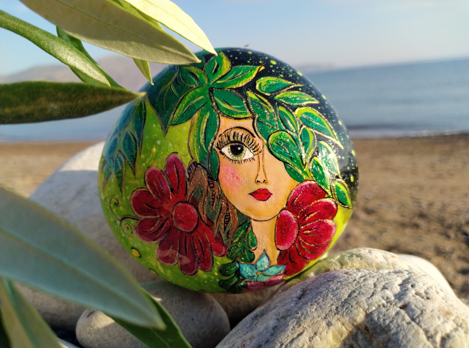 This hand-painted sea stone features a beautiful Nature-inspired face,surrounded by delicate flowers and leaves,symbolizing the deep connection between humanity and the natural world.The intricate design captures the essence of Nature’s beauty,growth and tranquility,making it a truly unique piece.