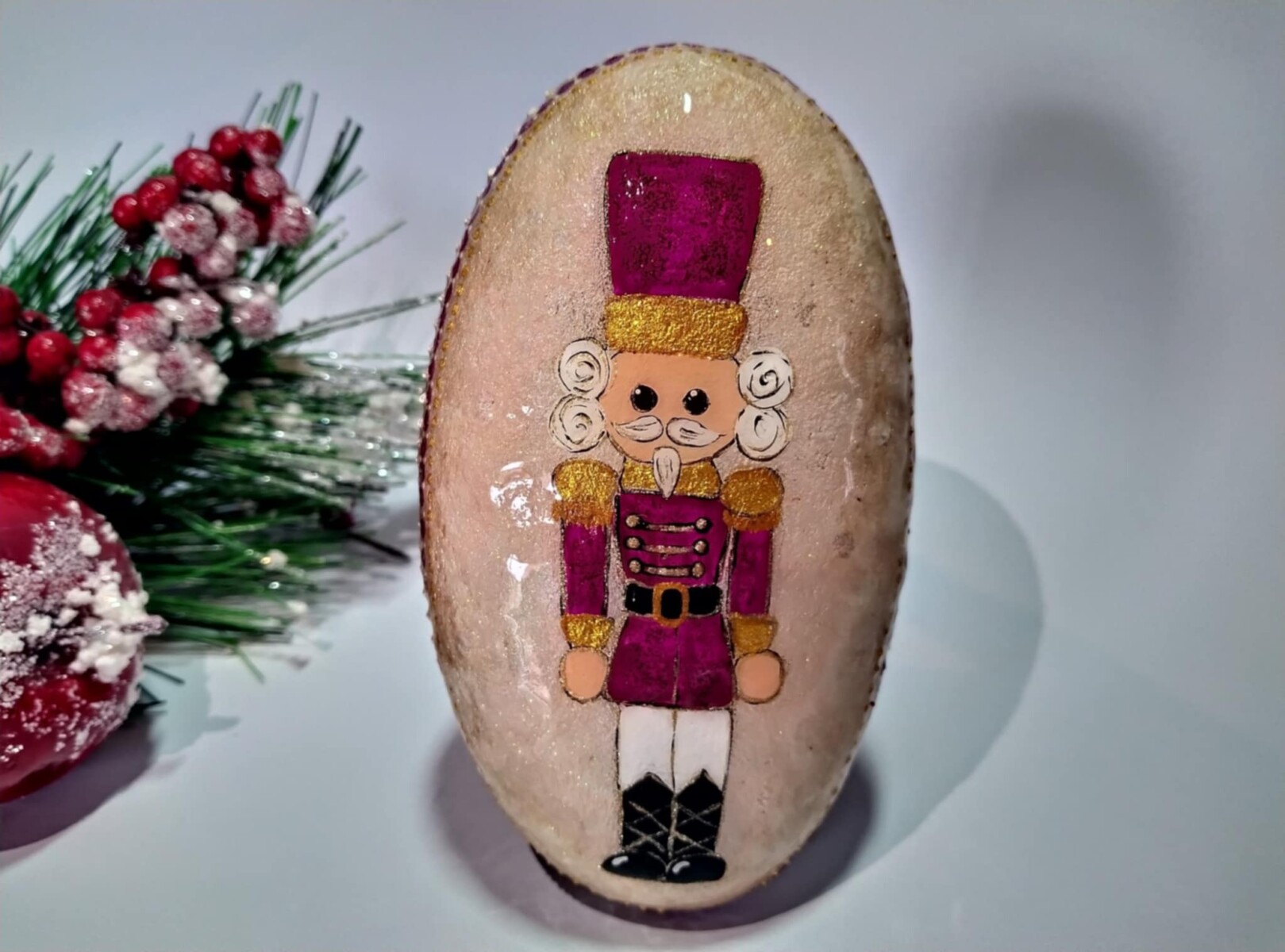 A bold and cheerful hand-painted sea stone features a classic nutcracker soldier,standing proud and ready to guard Your holiday spirit with a twinkle in his eye!