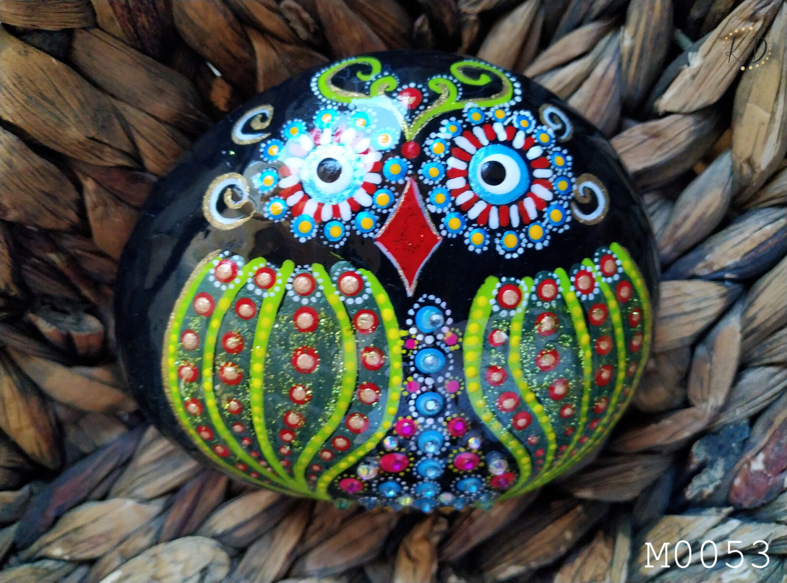 A wise little owl,brought to life with delicats brushstrokes,dots and vivid colors,perches proudly on a smooth ocean-washed sea stone.