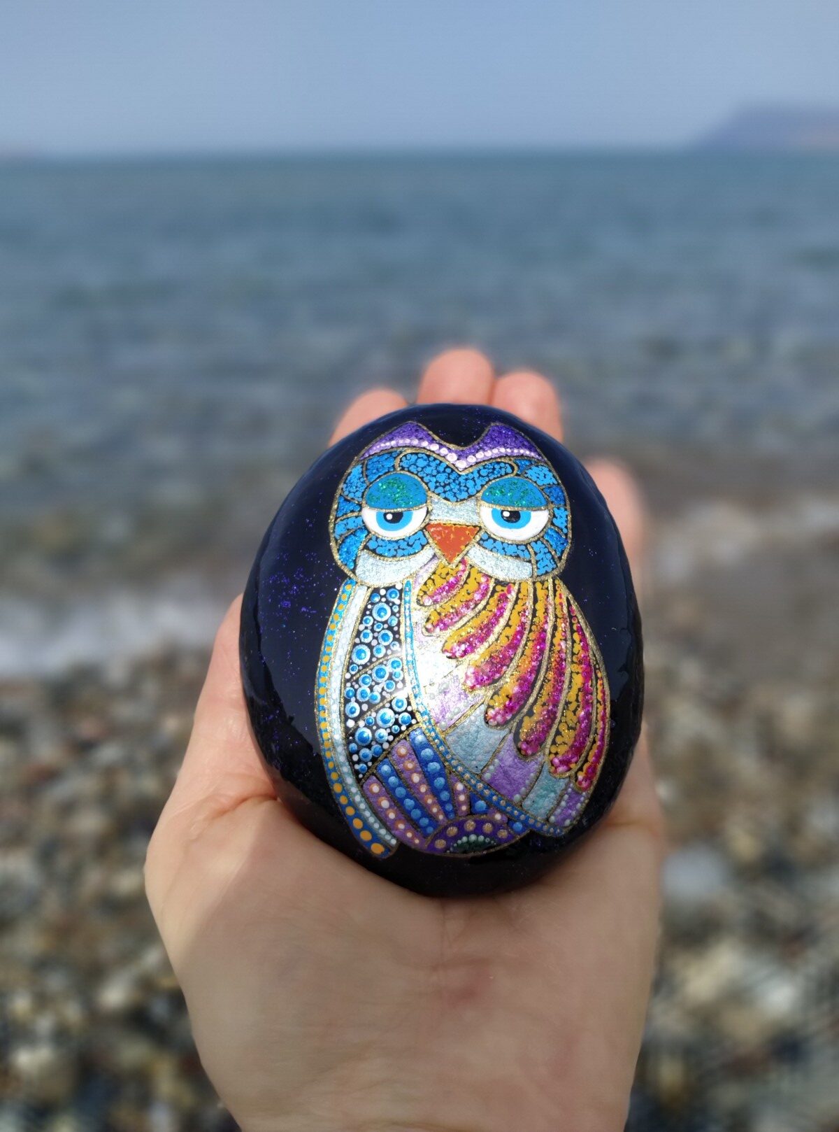 A wise little owl,brought to life with delicats brushstrokes,dots and vivid colors,perches proudly on a smooth ocean-washed sea stone.