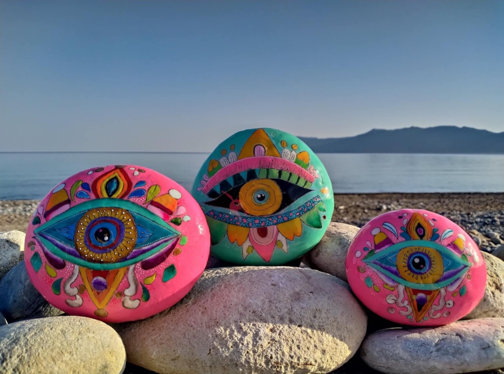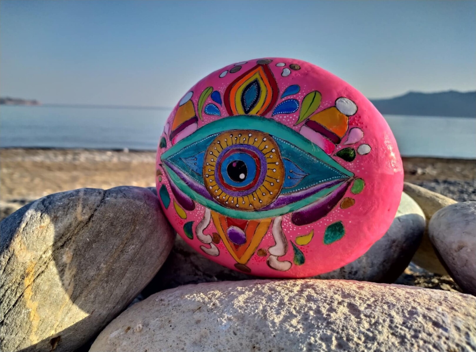 This one-of-a- kind-sea stone features a vivid hand-painted psychedelic eye, a symbol of perception,mystery and inner vision.It radiates vibrant energy and intuition,hand -painted with care and soul on a smooth Cretan stone.