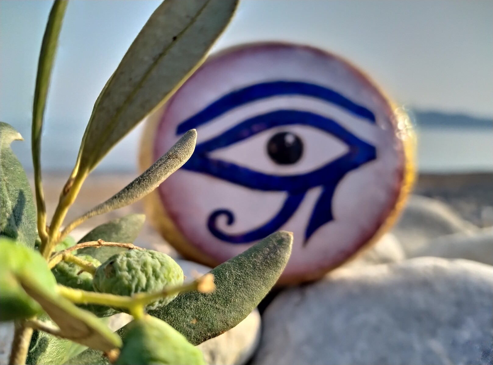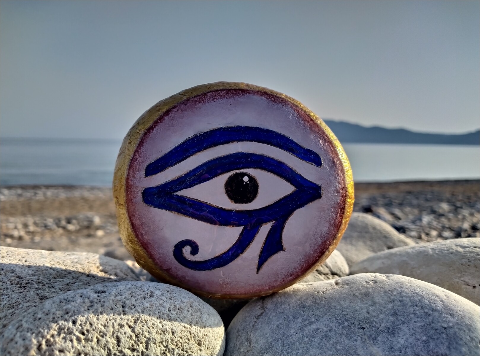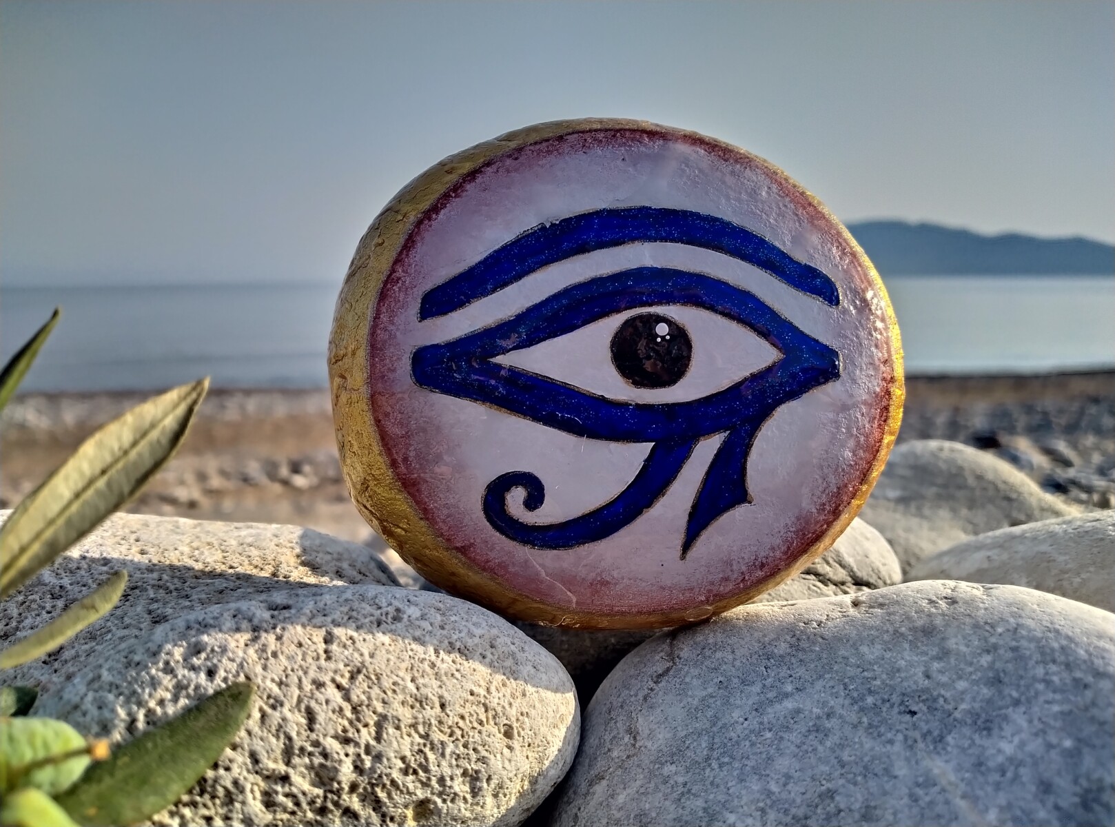 A hand painted Eye of Horus watches from the surface of a smooth sea stone,symbolizing protection.power and ancient wisdom.The design brings a sense of mystique and timeless strength.