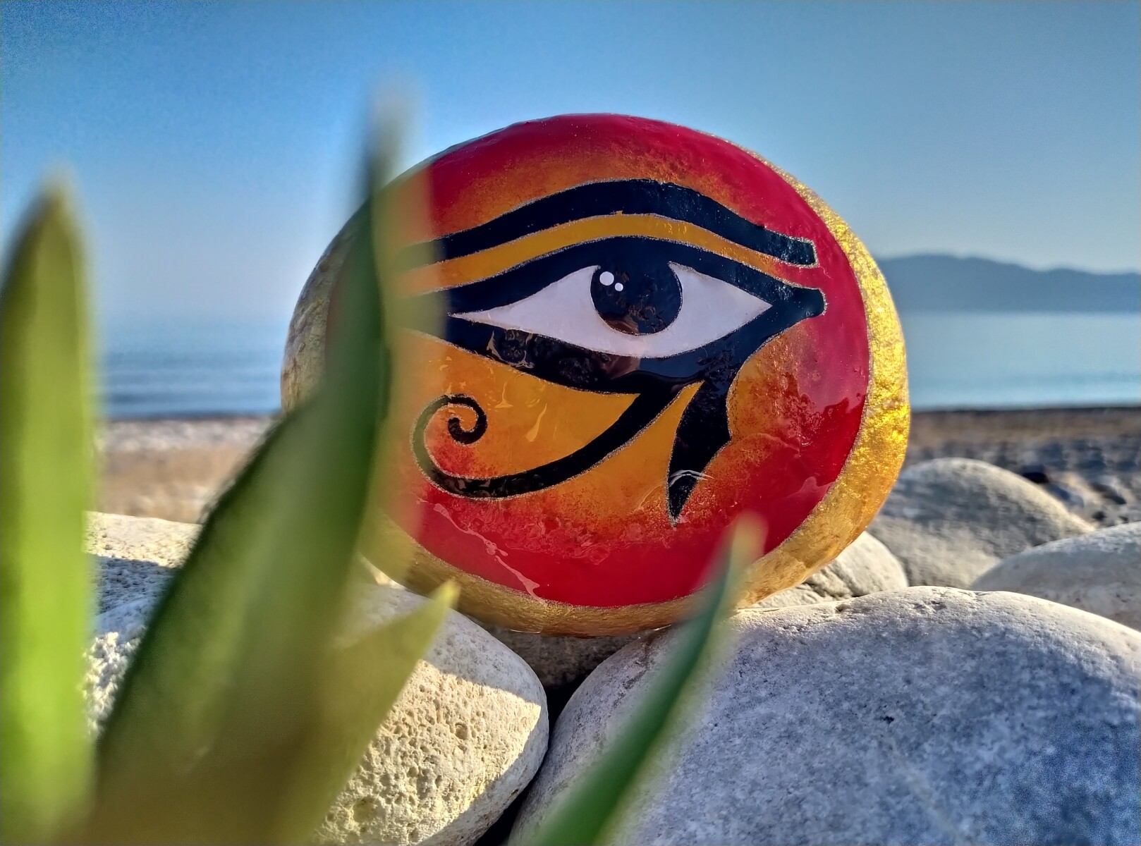 A hand painted Eye of Horus watches from the surface of a smooth sea stone,symbolizing protection.power and ancient wisdom.The design brings a sense of mystique and timeless strength.
