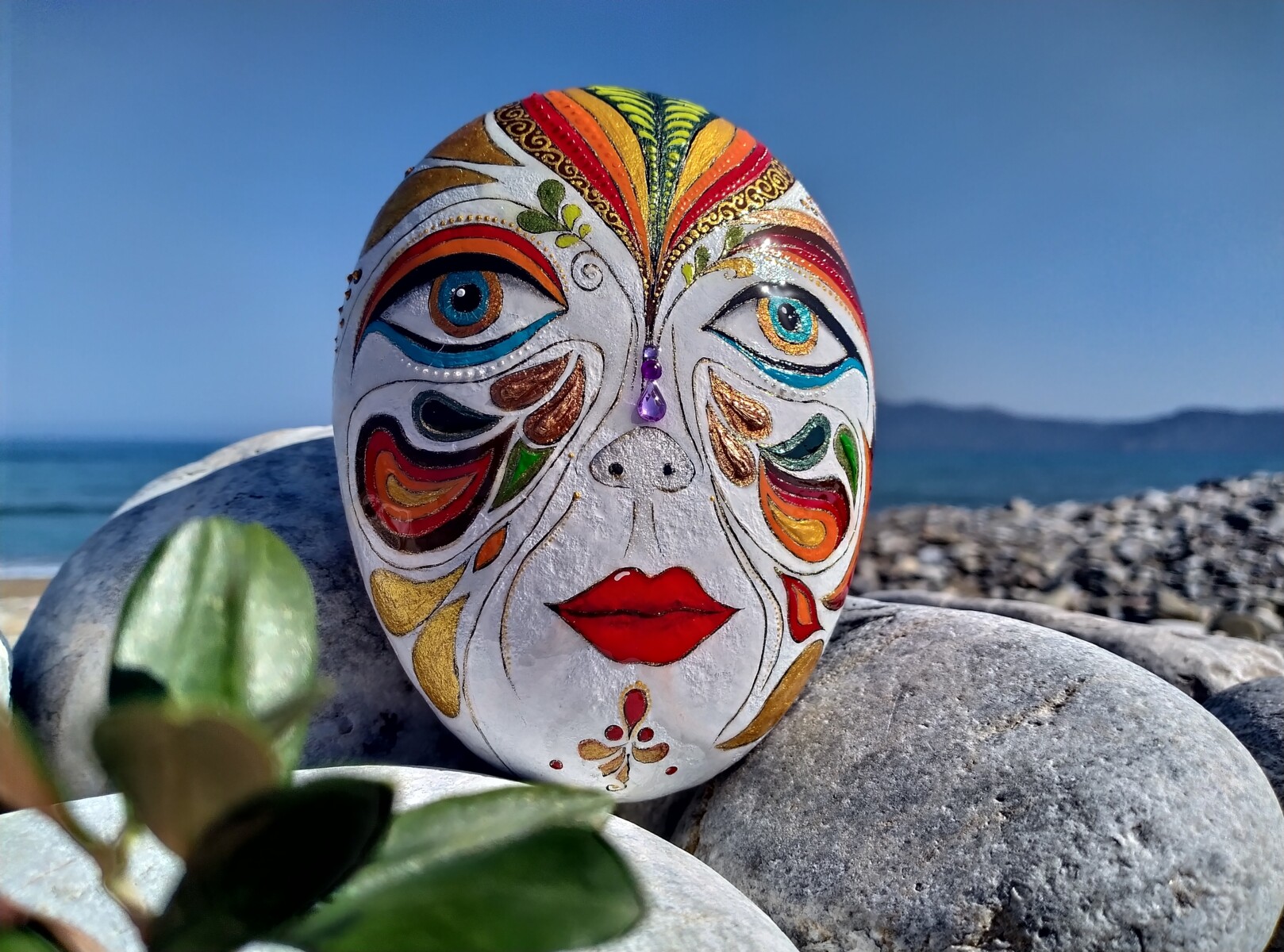 A hand painted Venetian Mask graces the surface of the stone,evoking mystery and elegance with its intricate design.The stone becomes a small canvas of drama and allure,capturing the spirit of masquerade in a unique,artistic form.