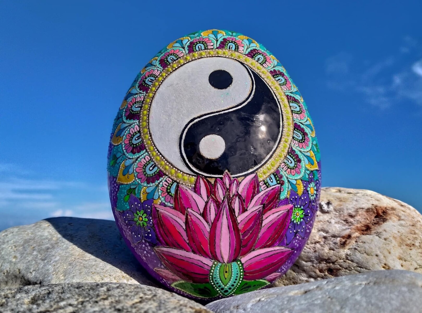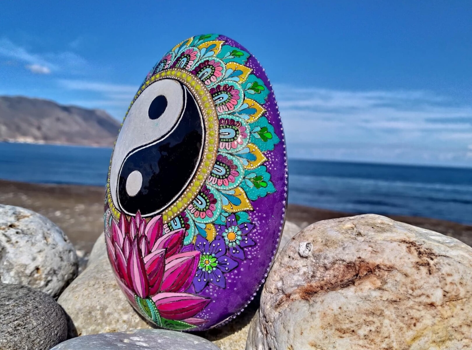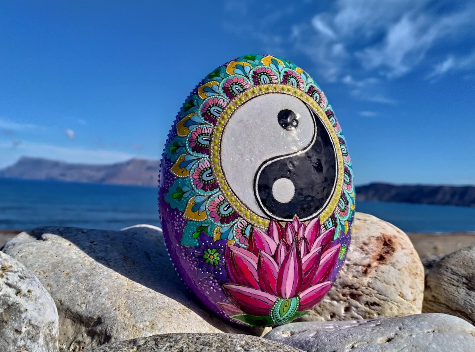 This hand-painted sea stone features the Yin Yang symbol and Lotus flower,representing the balance and harmony of opposites in the Universe.Its intricete desin brings a sense of peace and equilibrium,making it a meanigful and unique piece.